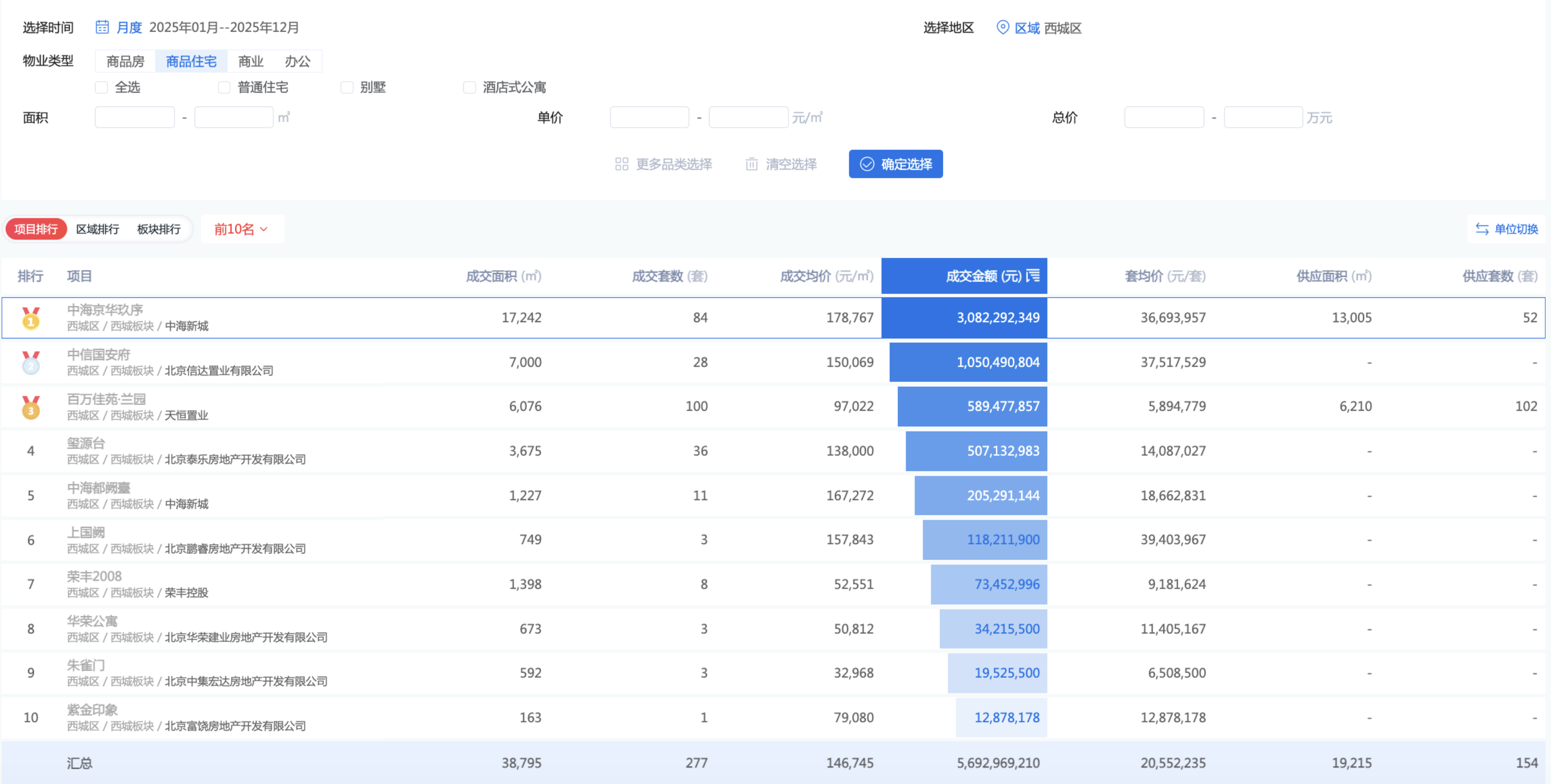 根据西城区2025年度商品住宅网签金额排行榜显示,中海京华玖序以30.82亿元的成绩排名第一。