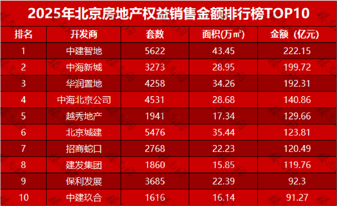 最终,中建智地以222.15亿元,登上了2025年北京房地产权益销售金额榜单的头把交椅,较2024年,提升一个身位。