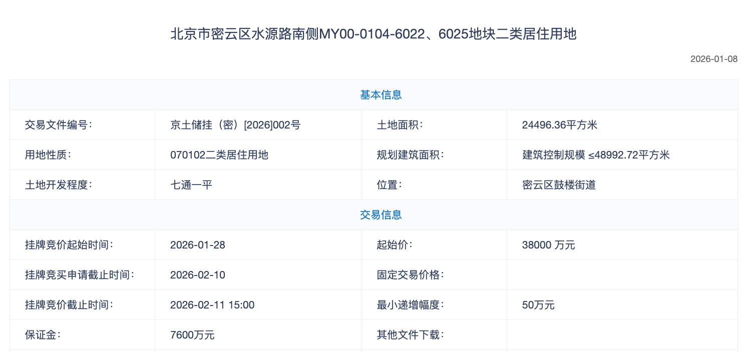1月8日,密云区水源路南侧0104-6022、6025地块正式挂牌出让。