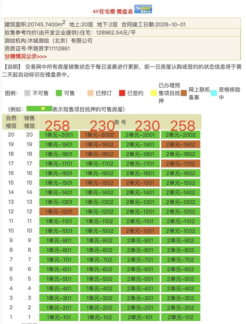 4#楼王也卖不动,中间户是230㎡,供应40套,网签6套;边户是258㎡,供应40套,网签3套。