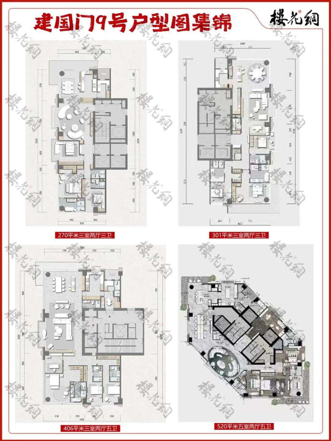 它共规划6栋楼,其中1-3号为住宅楼,共计97套,户型段位为270/301/406/510平,以及少量顶层复式414-900平。
