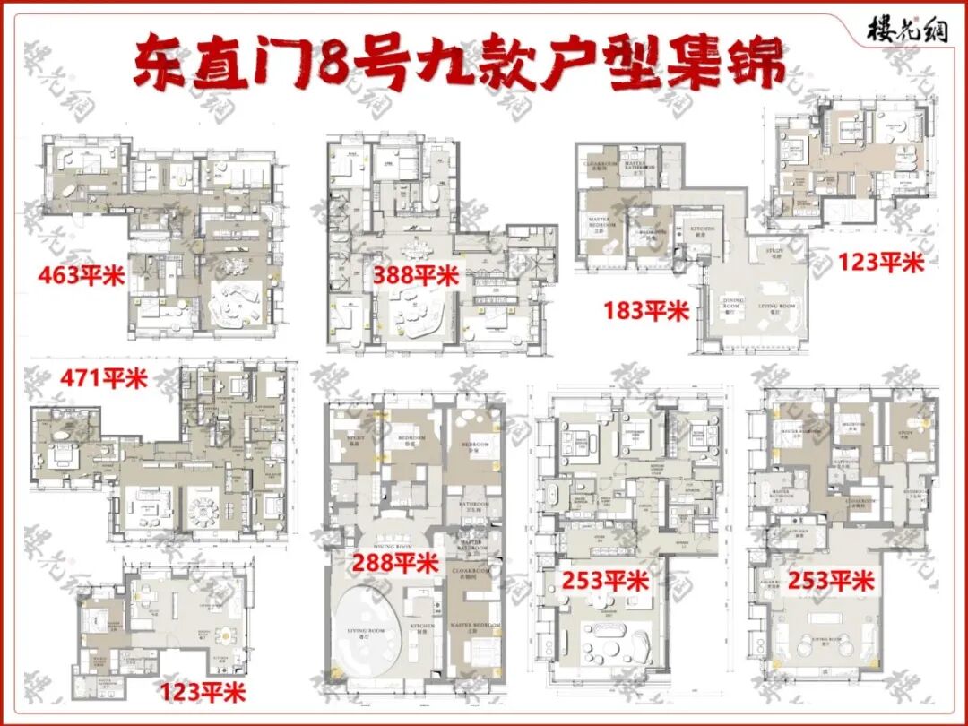 只规划一栋楼,32层、两个单元,共计9款户型,单套面积为123平米、183平米、253平米、288平米、383平米、460平米、471平米。