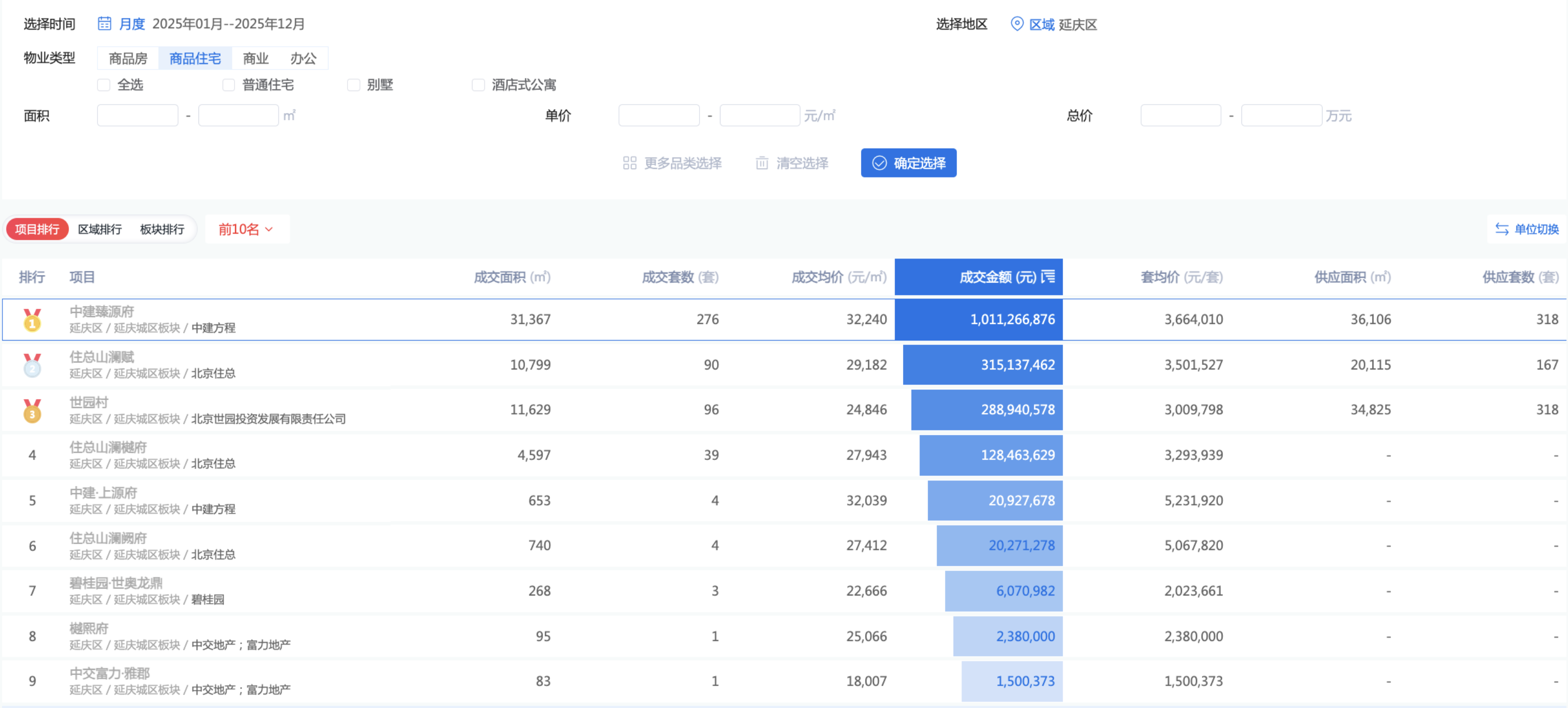 根据2025年北京商品住宅网签金额排行榜显示,开盘仅3个月的中建臻源府,以10.11亿元的成绩排名延庆区榜首。