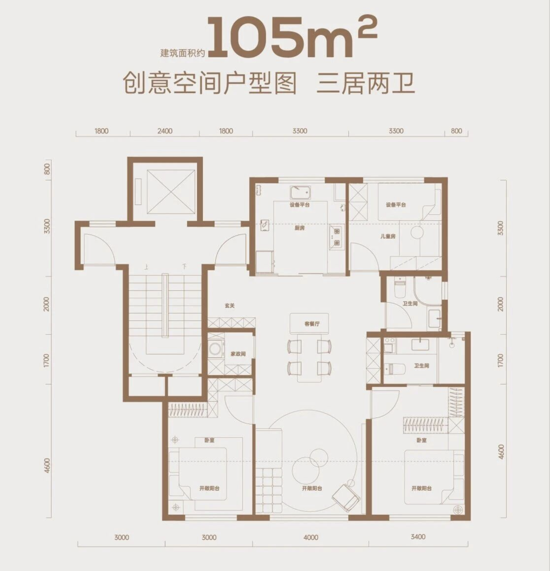 主力105㎡三居两卫,全明户型。