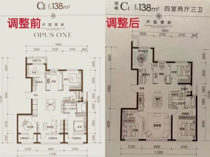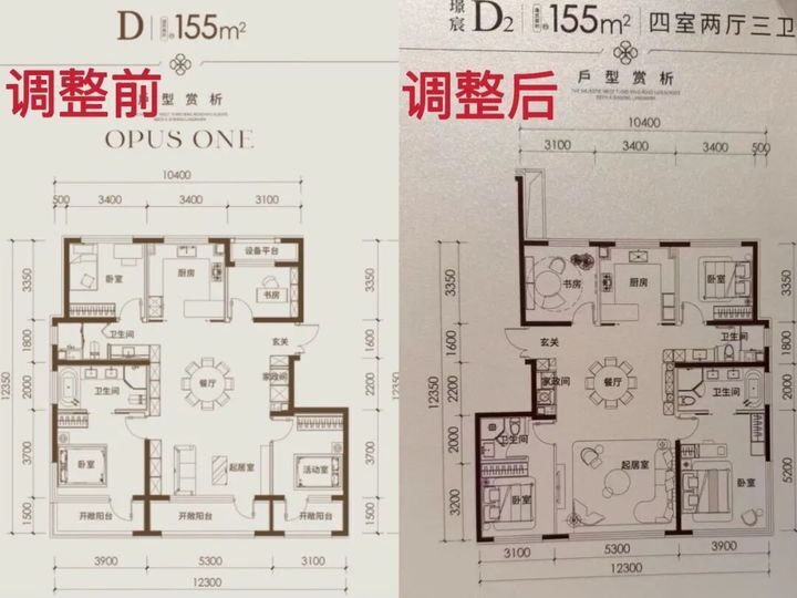 主力138㎡和155㎡户型,都是四居,原本很尴尬,也只有两个卫生间;