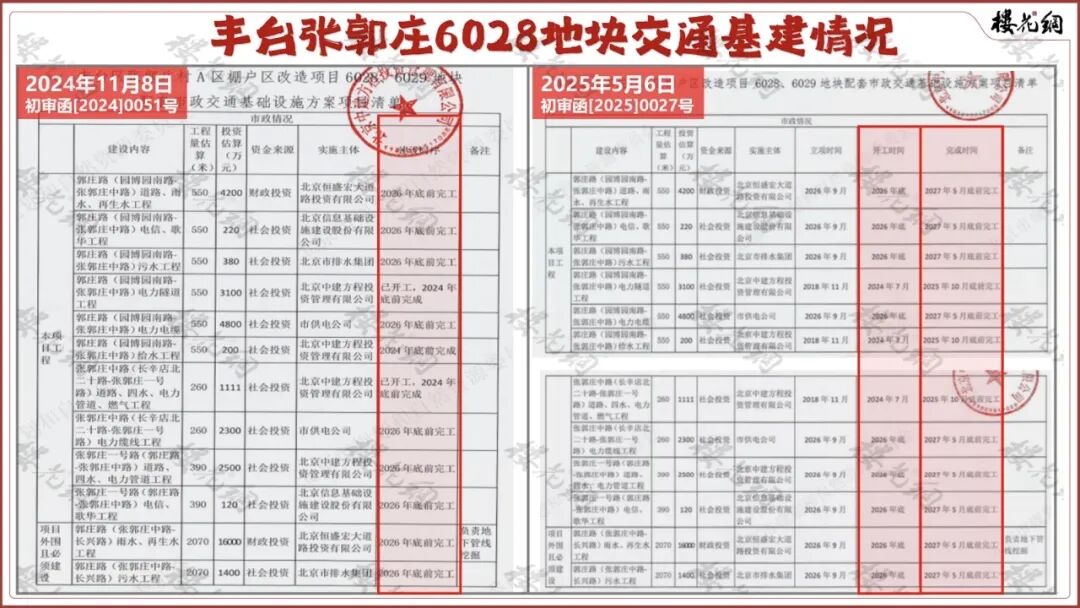 里面附了一张张郭庄6028、6029地块的市政交通基础设施实施清单,涉及12项工程,其中4项完工时间为2024年底,8项完工时间为2026年底。