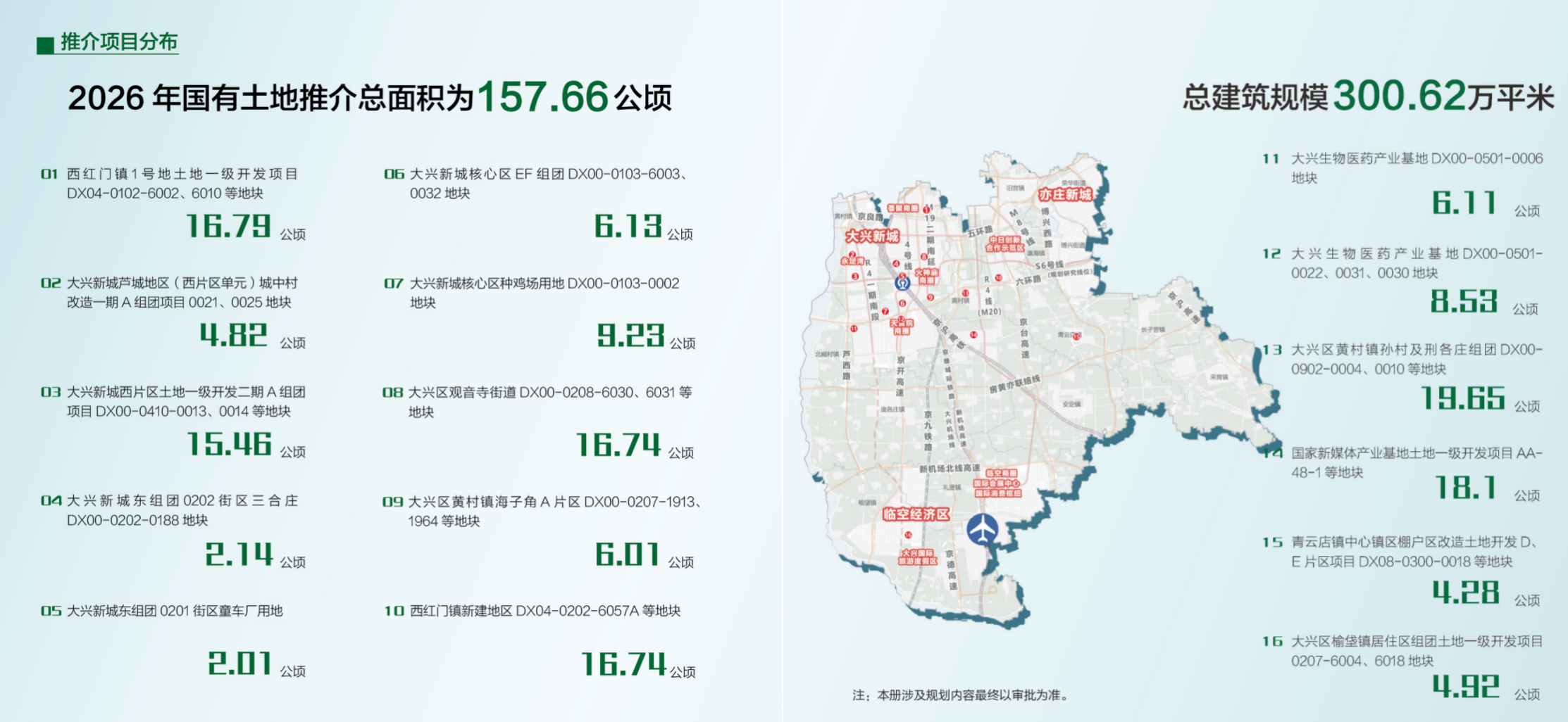 2026年,大兴区共推出16宗涉宅地块,总面积157.66公顷,建筑规模超300万方。
