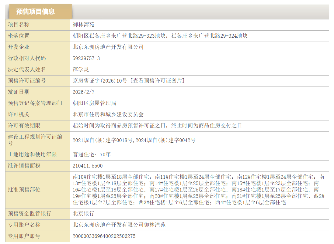 2月7日,首农御林湾拿到预售证,备案名“御林湾苑”。