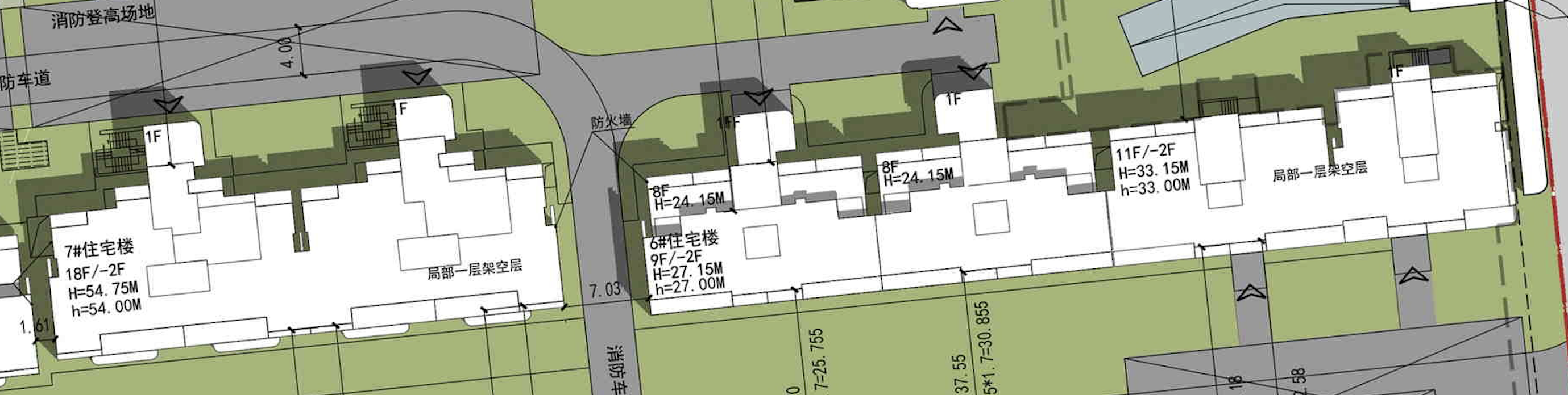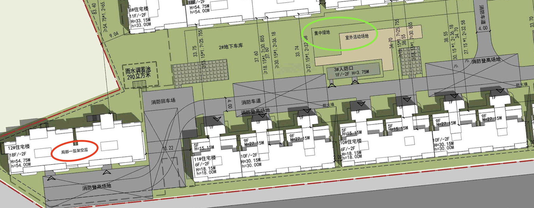 12栋住宅楼,有8栋做了首层(局部)架空层。