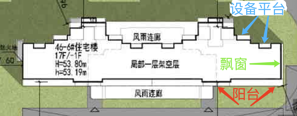 中央6号楼首层局部架空,南北两侧也都做了风雨连廊。