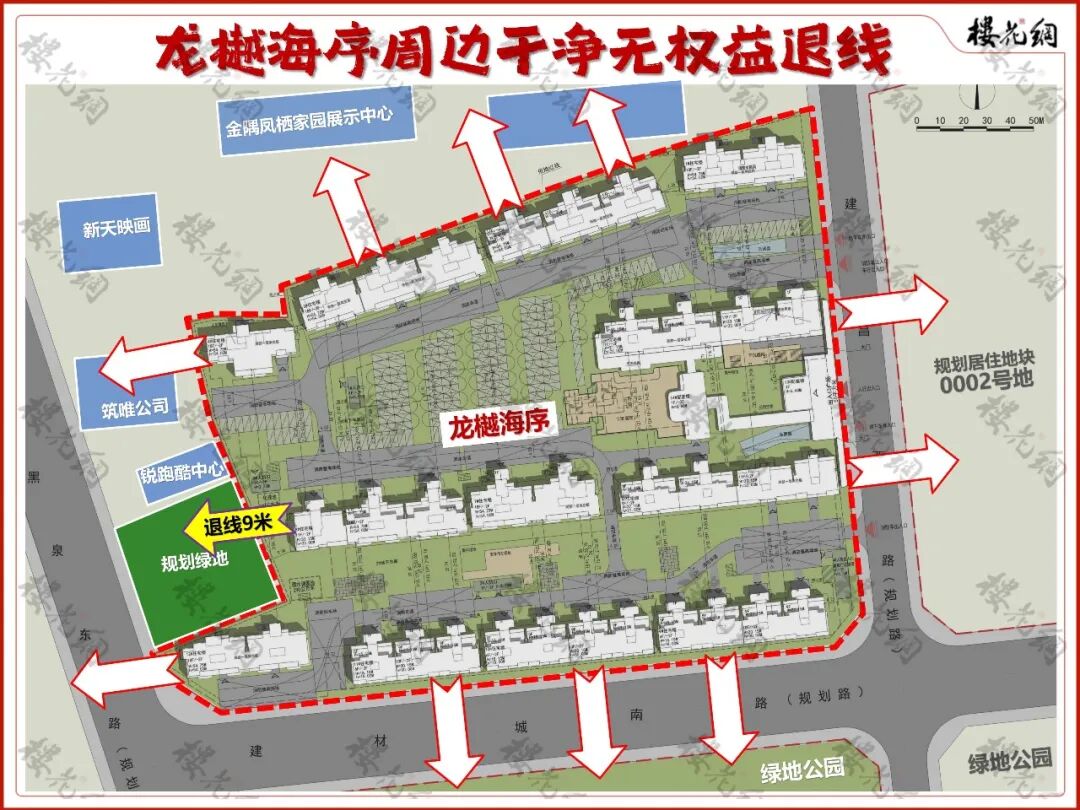 于是,从图纸上看,龙樾海序规划的12栋住宅楼,沿着红线,呈满铺状态,几乎没有浪费占地。唯有西边的8#,往东退了9.04米。