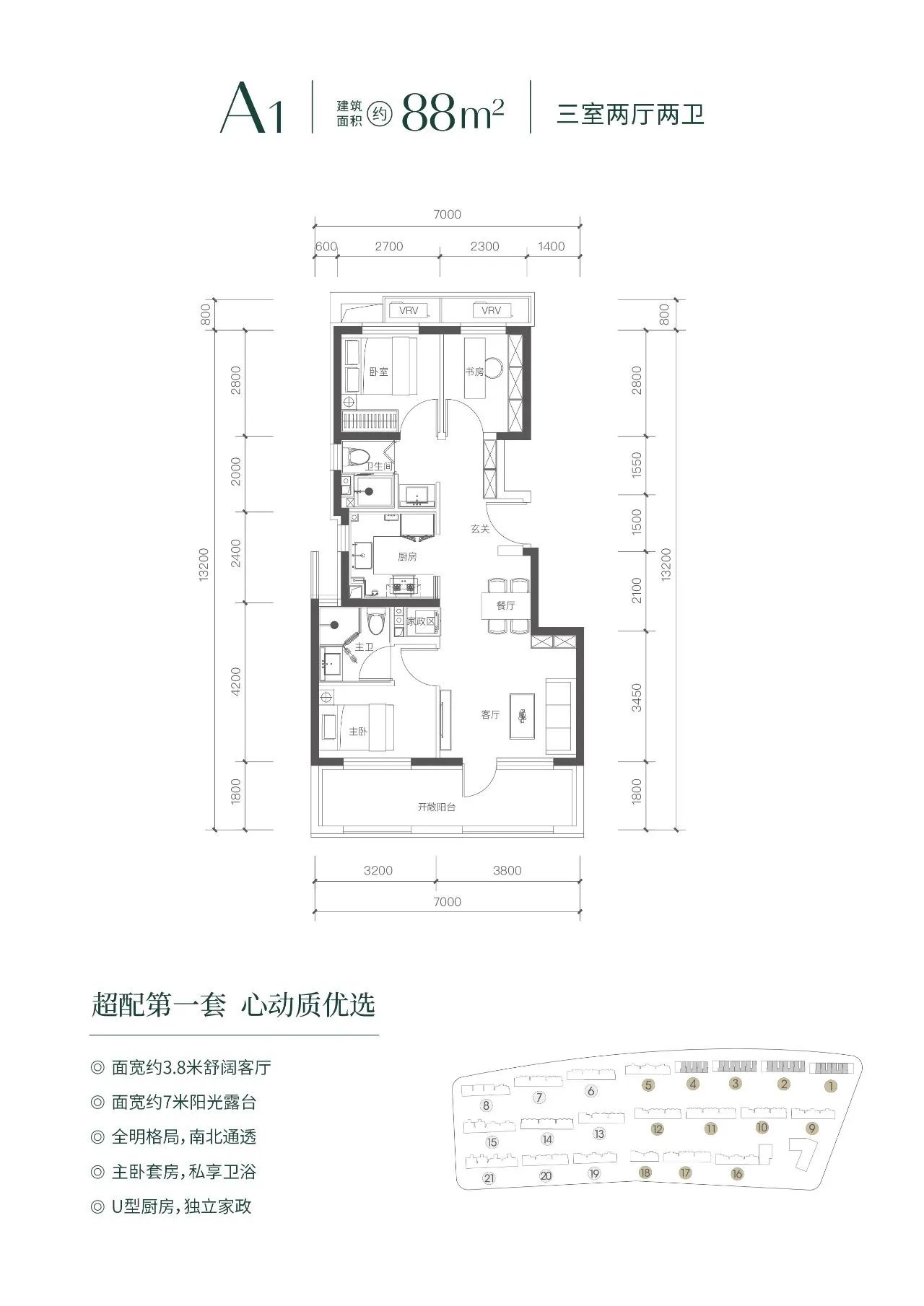 以88㎡三居两卫,南向7米长通面宽阳台,1.8米进深;北向还有5米长的设备平台+防火挑檐,进深0.8米,赠送面积总计超10㎡,扩容近12%。