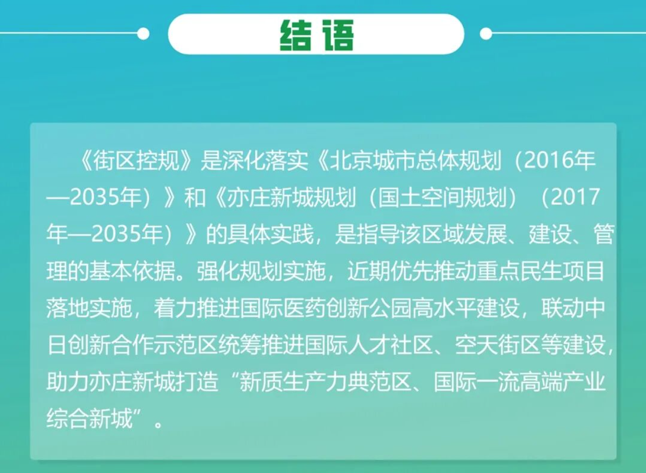 《街区控规》是深化落实《北京城市总体规划 (2016年-2035年) 》和《亦庄新城规划 (土空间规划) (2017年-2035年)》的具体实践,是指导该区域发展、建设、管理的基本依据。强化规划实施,近期优先推动重点民生项目落地实施,着力推进国际医药创新公园高水平建设,联动中日创新合作示范区统筹推进国际人才社区、空天街区等建设助力亦庄新城打造“新质生产力典范区、国际一流高端产业综合新城“