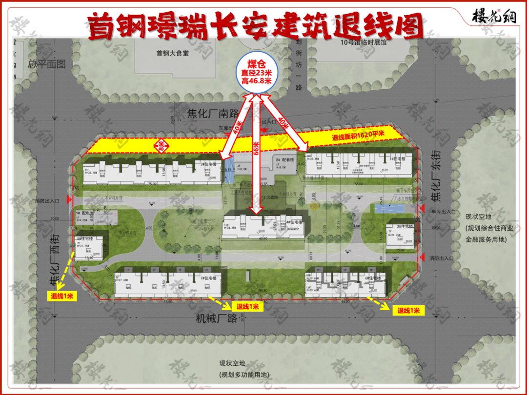 b、与北边工业遗存煤仓南侧距离,不小于40米,并在东西方向上尽量拉开与煤仓距离;