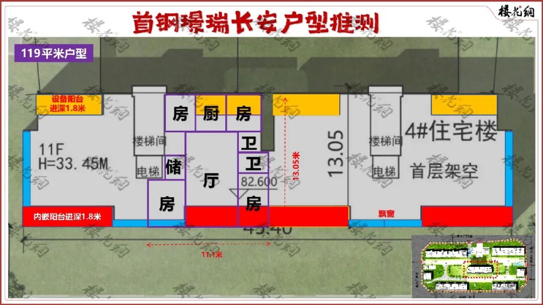 它户型的赠送手段很大:南向内嵌阳台半送+北向设备平台全送+飘窗全送。南北阳台阳台进深,皆为1.8米。