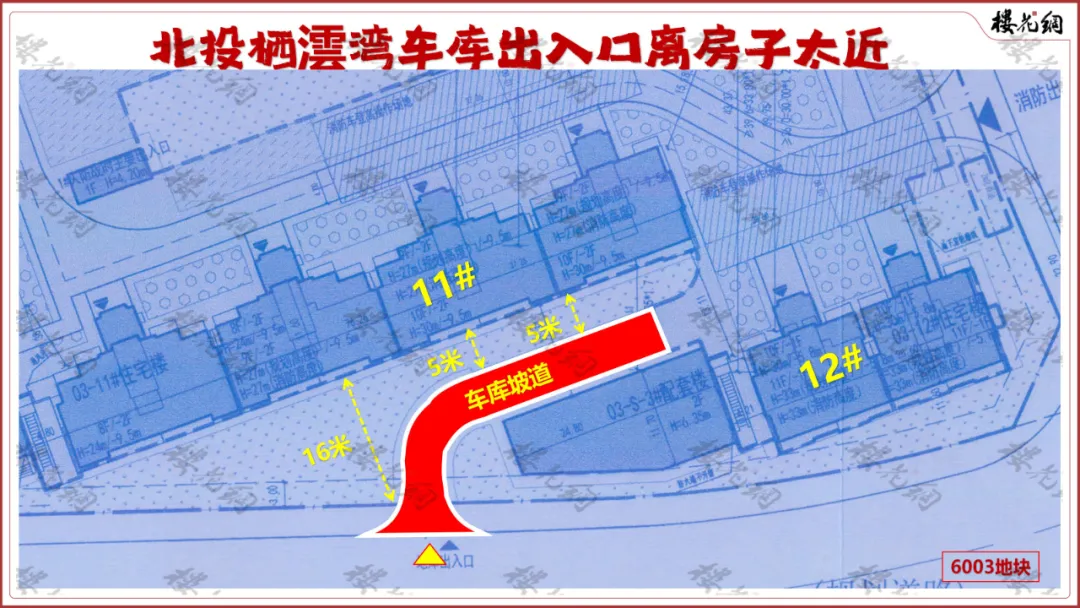 2、车库。6003地块的车库出入口的坡道,距离11#过近,仅有5米。