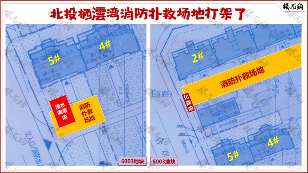 4、消防。6003地块的雨水调蓄池、化粪池,设在消防扑救场地上,不合规。