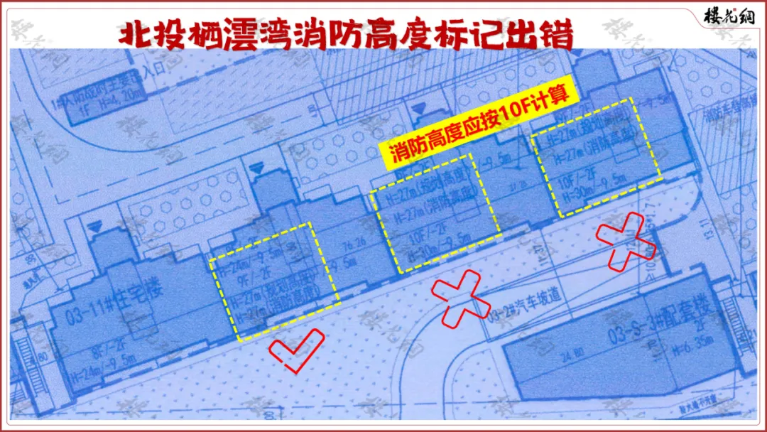 不仅如此,西地块(6003号)的11#还出现了乌龙,东面两个单元的消防高度标错了位置,不应该标北面的退台高度,应标在10F的地方,也不是27米。