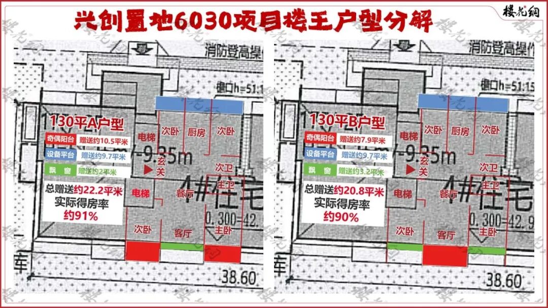 它所有的赠送手段加一起,为100%全赠送;而6038项目南向的开敞阳台,为赠送一半面积。