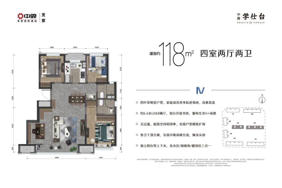 118m²顶配四居,位于4#、5#,此次首开5#,拟售均价36866.67元/m²,得房率约75%。