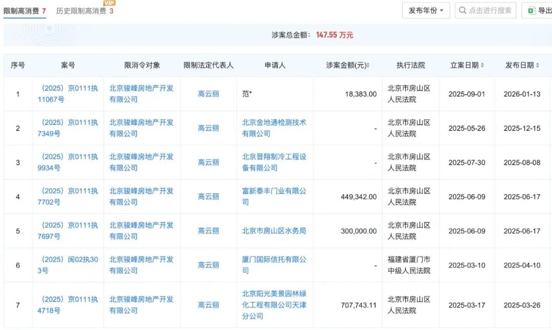 眼下,北京骏峰房地产已多次欠税、“限高”和“被执行”。限消令申请人包括工程设备公司、门业公司、园林绿化公司等原来的合作方,甚至还有股东厦门国际信托。