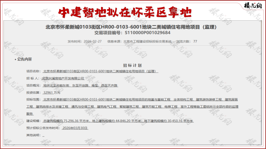 2月27日,兴澜地产为了怀柔新城0103街区HR00-0103-6001地块,连发四道招标计划,有关土方工程、监理、施工和设计等。
