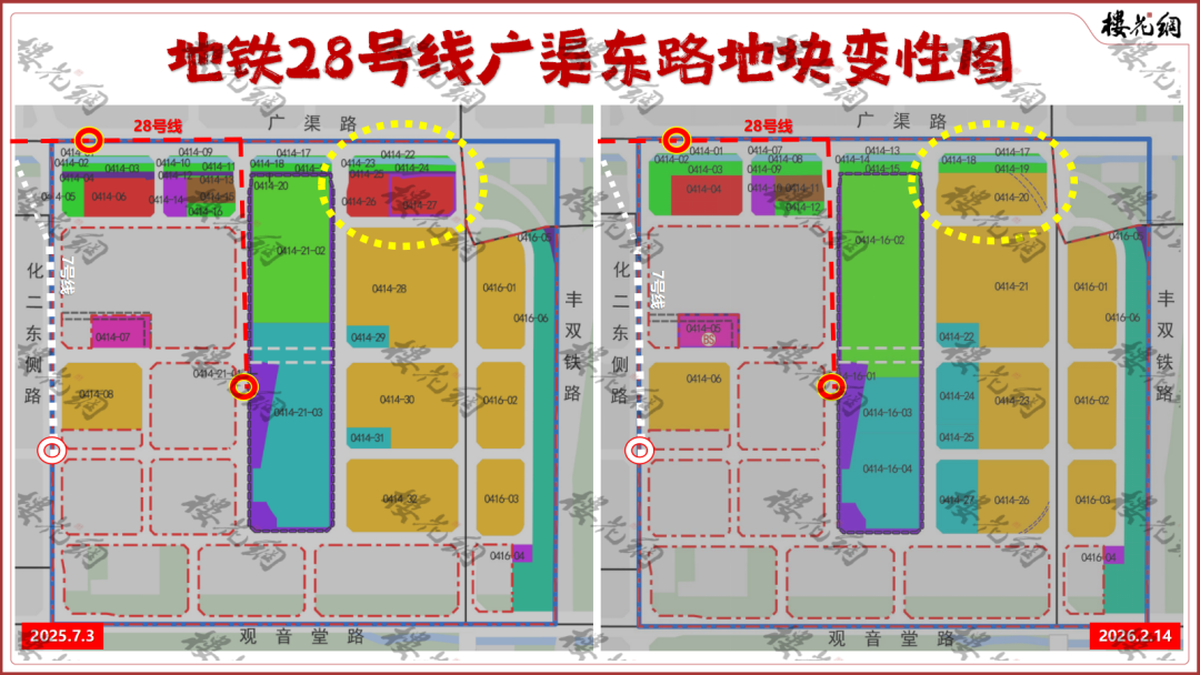 1、东北角的两幅商业服务业用地(原0414-26、27),合并为1幅住宅用地(现0414-20),使住宅地块从7块变成8块,建筑规模约61.5万㎡。