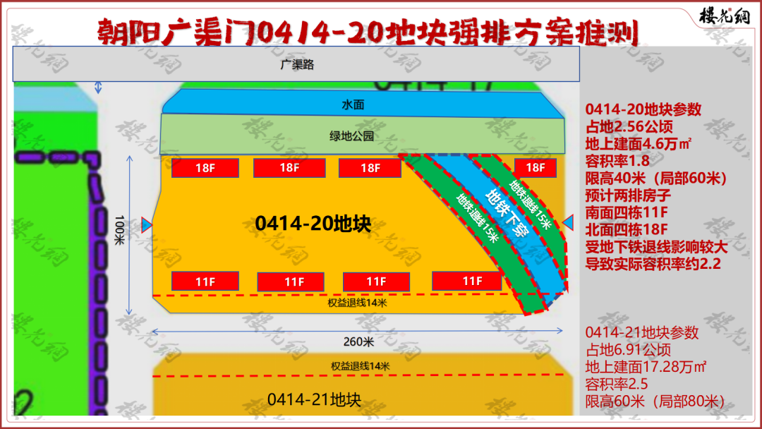 当然,0414-20地块也有自己的弱点,一条地铁下沉东北角。如果加上地铁退线,它的实际容积率将从1.8增至2.2左右。
