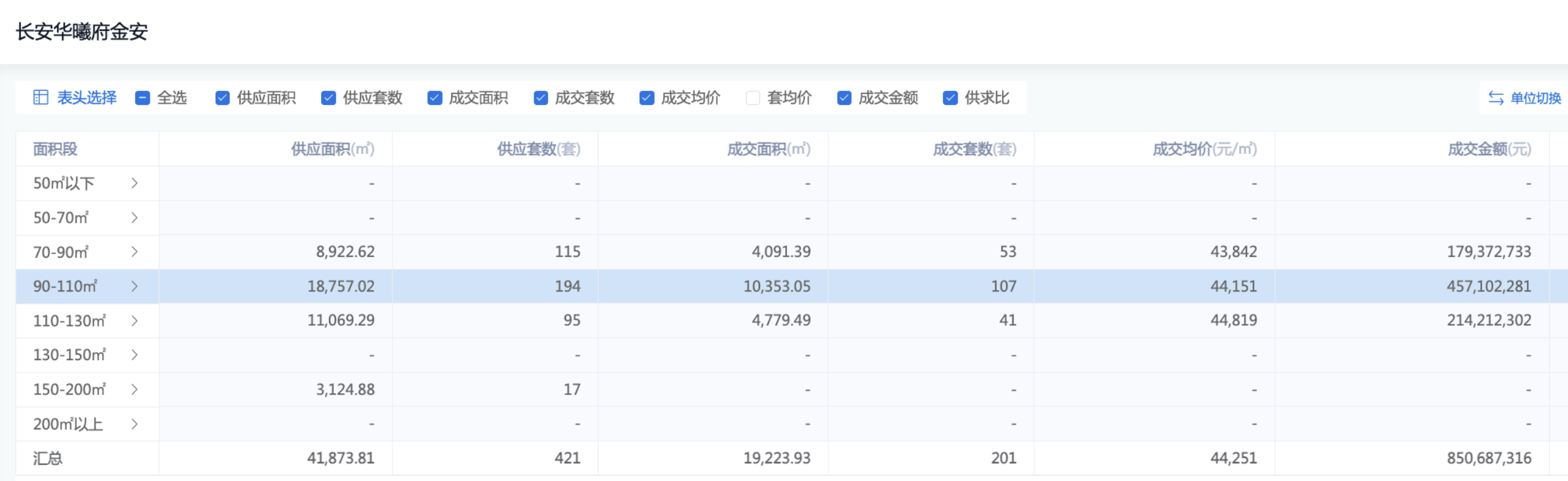与华曦府一期相比,二期金安更加聚焦小户型,砍掉了135㎡四居产品,最大建面做到118㎡。