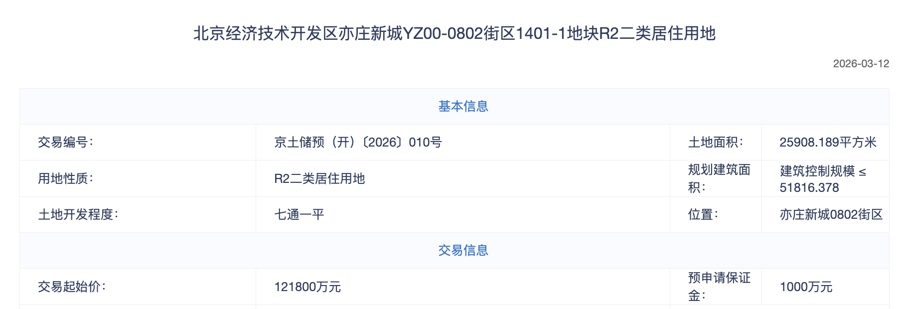 3月12日,北京经济技术开发区亦庄新城1401-1地块进入预申请流程。