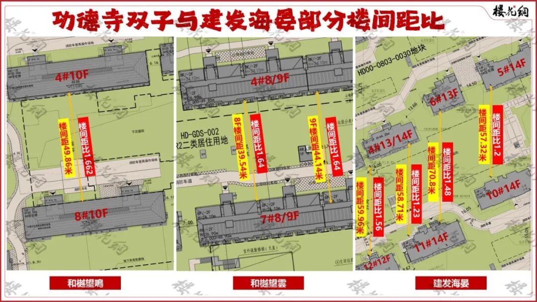 而功德寺双子板楼的楼间距比,整体在1.65上下;建发海晏地形朝南偏东超过20度,采用多种形式组合,楼间距比整体也基本达标。