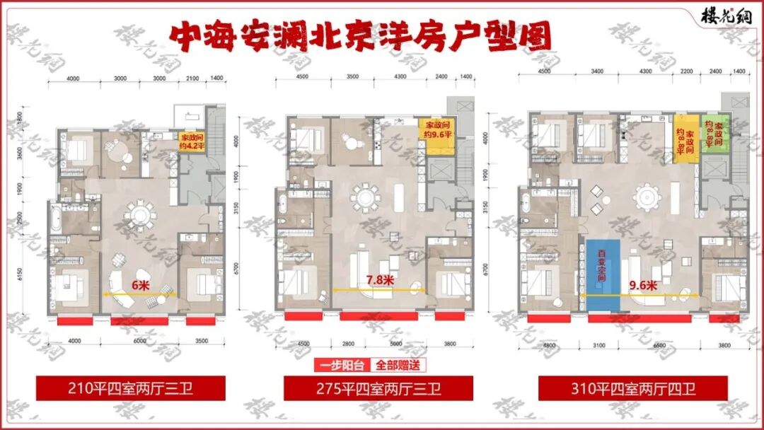 洋房主力户型有三款:210平米、275平米和310平米,叠墅户型为上叠315平米、下叠365平米,中叠大平层370平米。