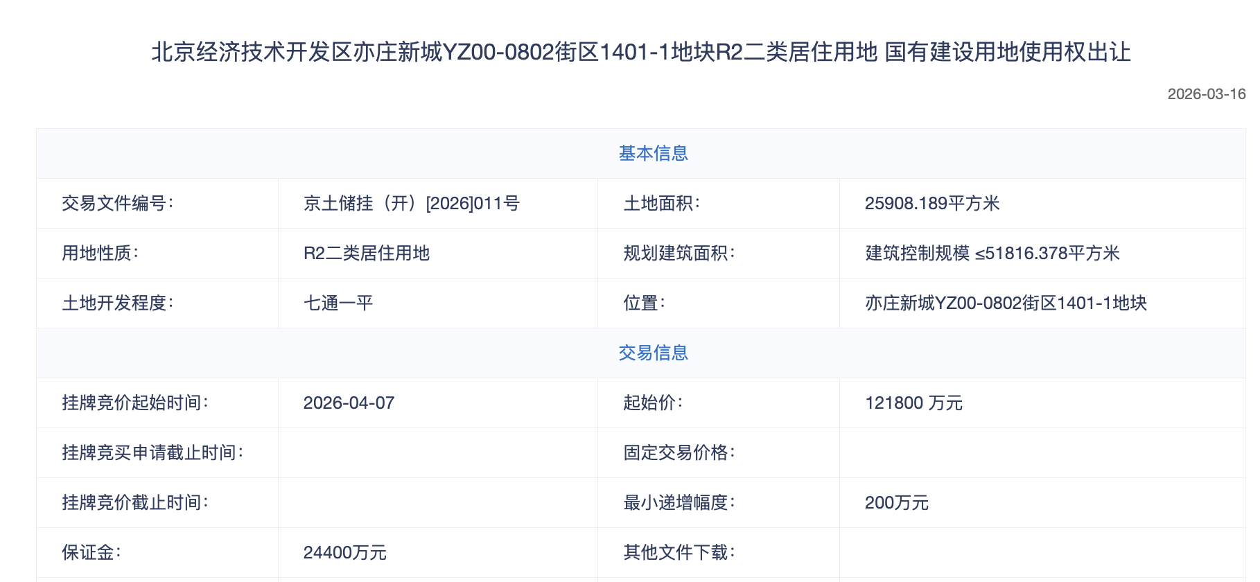 3月16日,亦庄新城0802街区1401-1地块挂牌了。