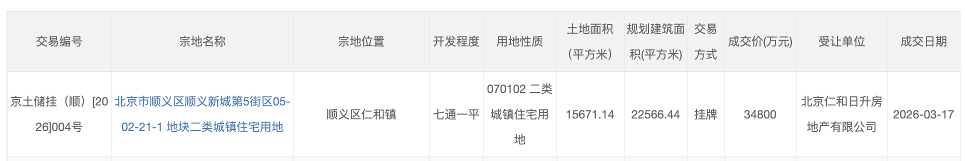 拿地企业:北京仁和日升房地产(顺义区属国企)