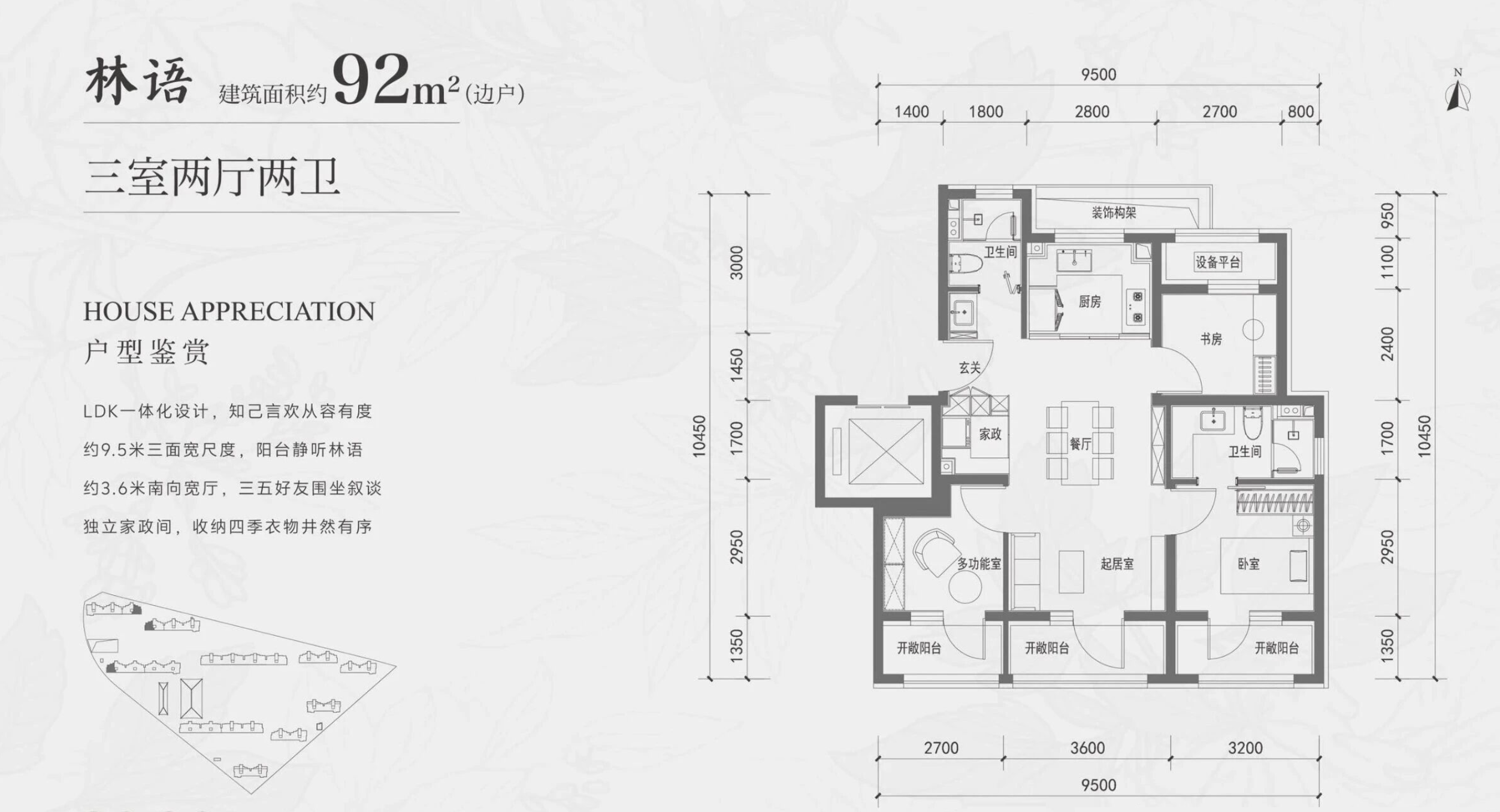 南向阳台、北向设备平台,边户L型转角飘窗,顶层送露台,得房率90%起,最高超95%。