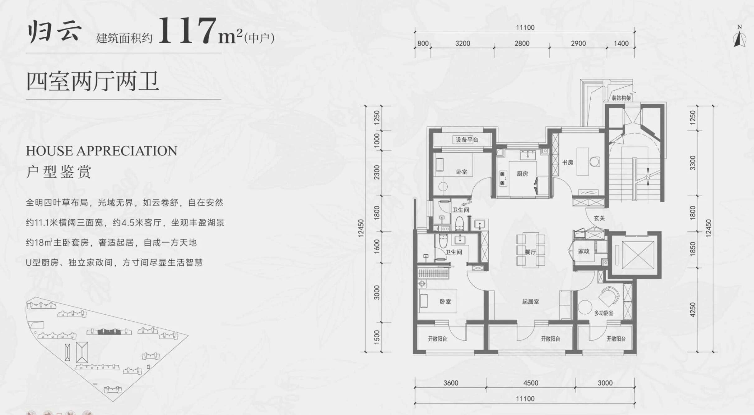 78㎡全边户小三居,92㎡南向三面宽,106㎡做全明四叶草,顶配117㎡湖景洋房。