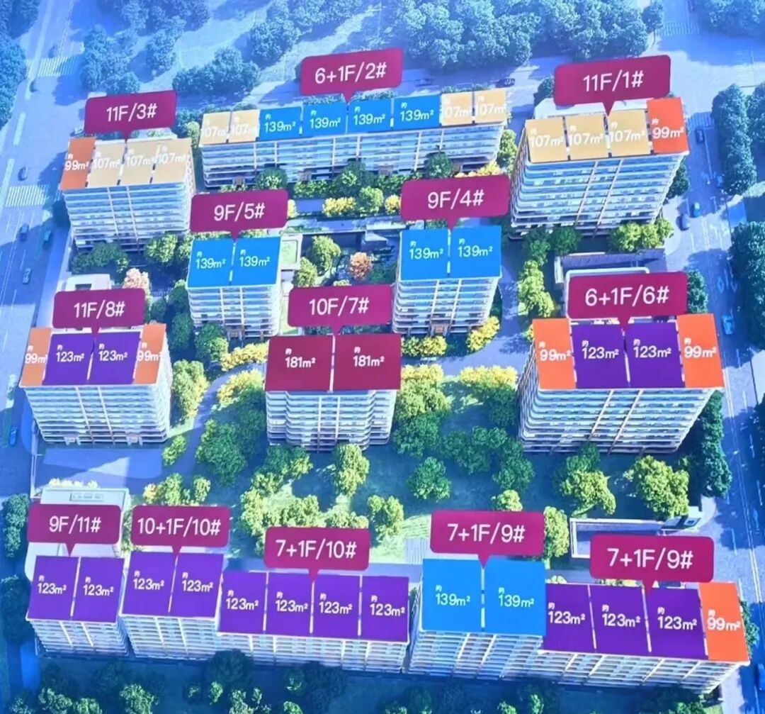 海宸元境共计11栋、414套房,社区体量更小,但选择面更广,户型99–107-123-139-181㎡。