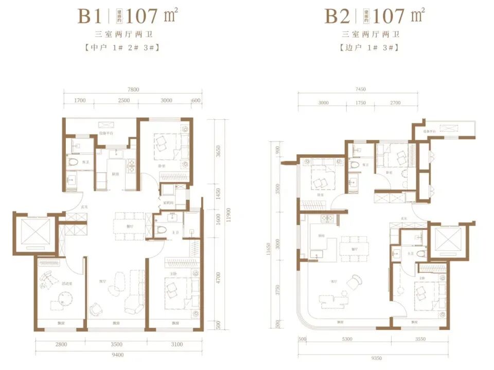 107㎡户型网签31套。该面积段做了两款差异化户型: