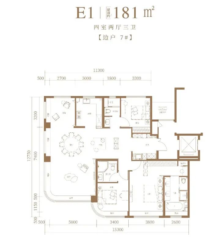 129㎡户型是四叶草四室,借鉴了丰台的北京隅西颂的设计思路,直接copy了转角餐边柜,连通到公卫洗漱盆。