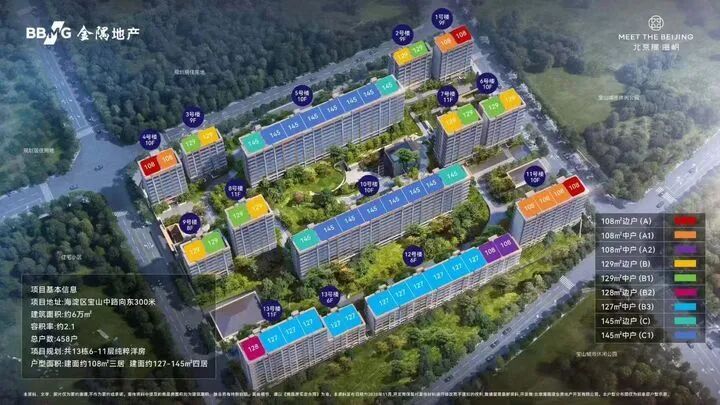 北京隅·海岄总建面约9.35万㎡,容积率2.1,规划13栋6-11F洋房,总计458户,针对纯改善群体,共三个面积段:108/129/145㎡。