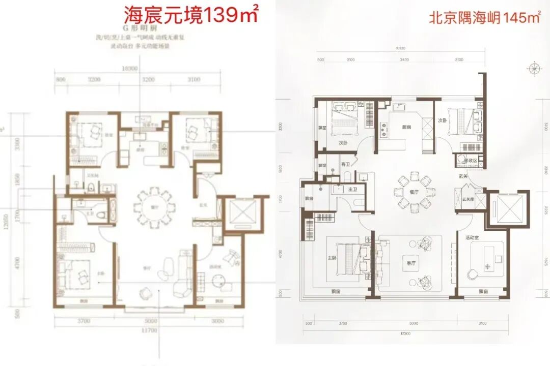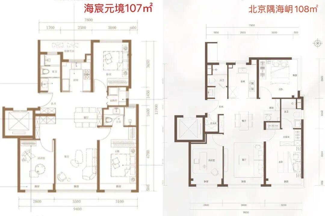 在同面积段户型上,海岄比海宸元境稍大,但是功能是一样的,都是三居或者四居。
