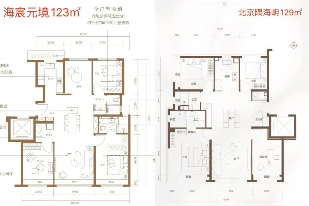 以海宸元境123㎡和海岄129㎡为例,都是四叶草四室,假设均价都是8万/㎡,两者总价相差近50万。