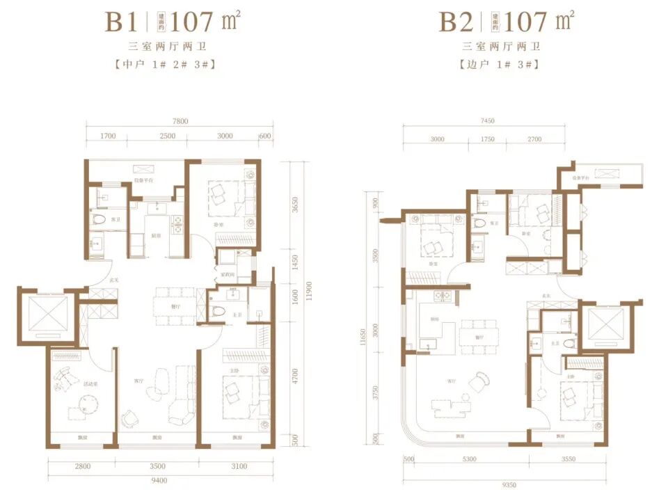 107㎡三居,约900万,就能选到心仪的好楼层。开发商甚至在这一面积段做了两款差异化户型: