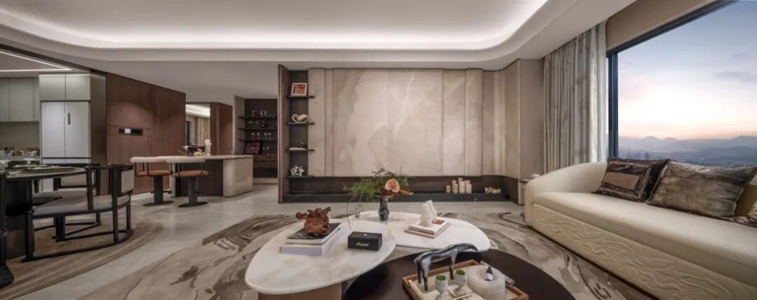 客厅才是真视觉暴击,5米面宽 270°W形弧面转角窗,地面卡里冰玉大理石拼花,背景墙是白雪公主玉石,高级感藏都藏不住。