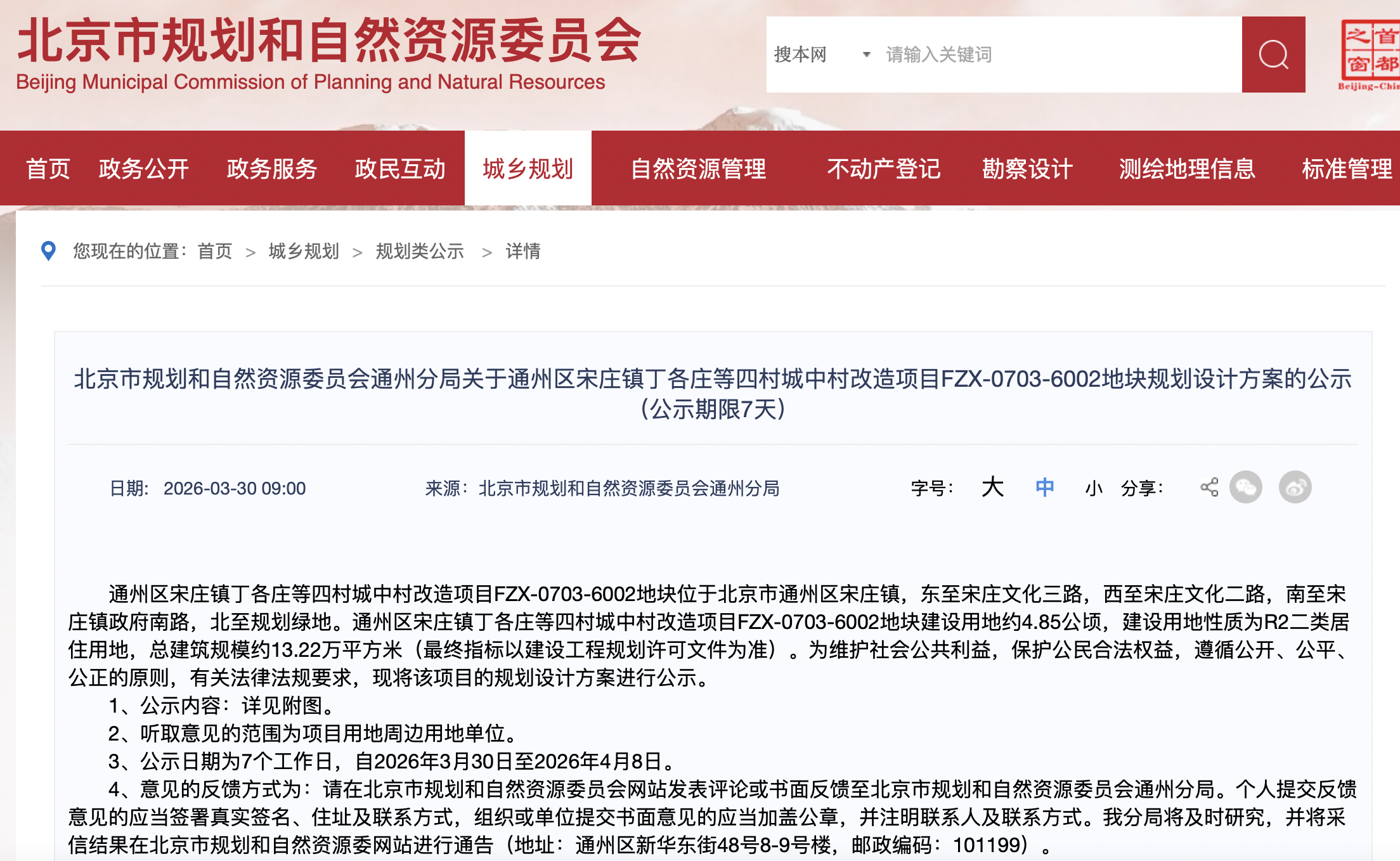 3月30日,通州区宋庄镇丁各庄等四村城中村改造项目FZX-0703-6002地块规划设计方案出来了。