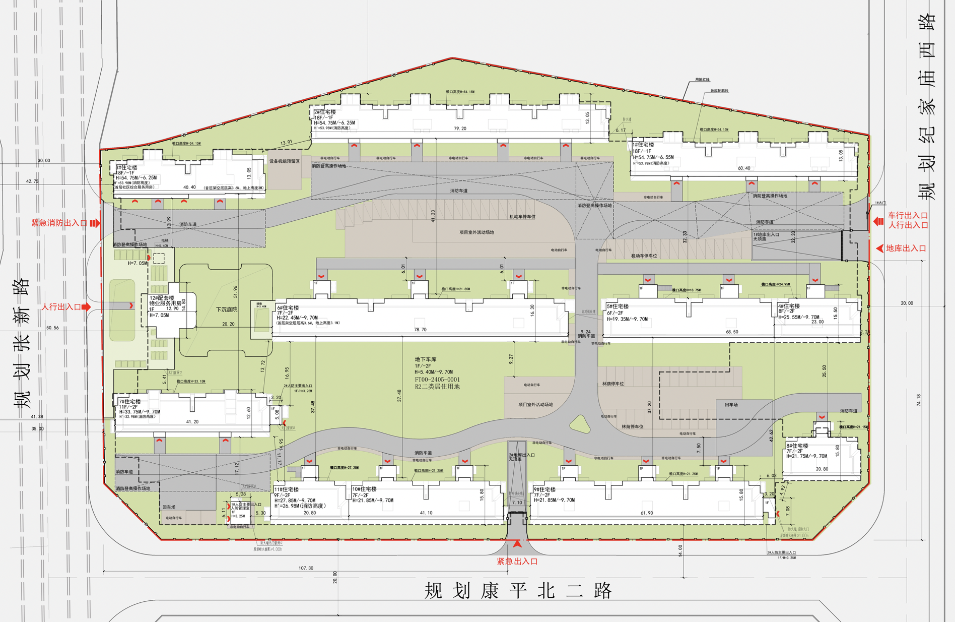 项目总用地面积约23542.66平方米,其中建设用地面积约23542.66平方米。项目规划11栋住宅楼,6层至18层,建筑高度约54.75米(最高),绿地率30%。