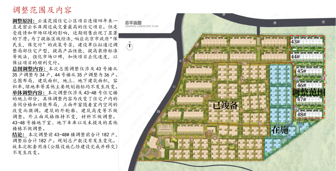 在规划调整原因里提到,该项目连续四年来一直是密云水库周边成交量最高的住宅项目,但是受疫情影响,以及市场对部分户型产品的反馈意见,近期销售出现了显著的下滑。