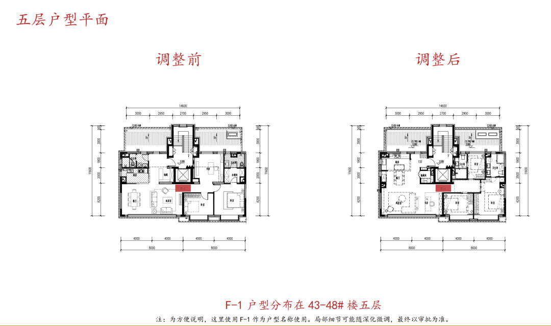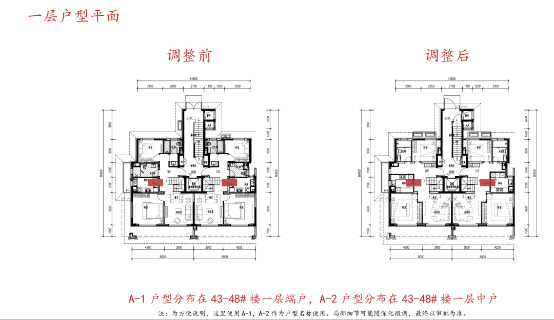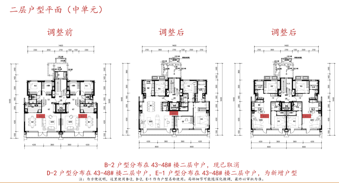 2、本次调整涉及43-48号住宅楼的地上部分,因为改变了住宅户内的房间分格和功能布局,立面开窗也随之进行微调。