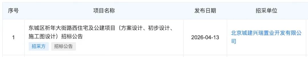 4月13日,其项目公司北京城建兴瑞置业,发布了一则设计招标公告。