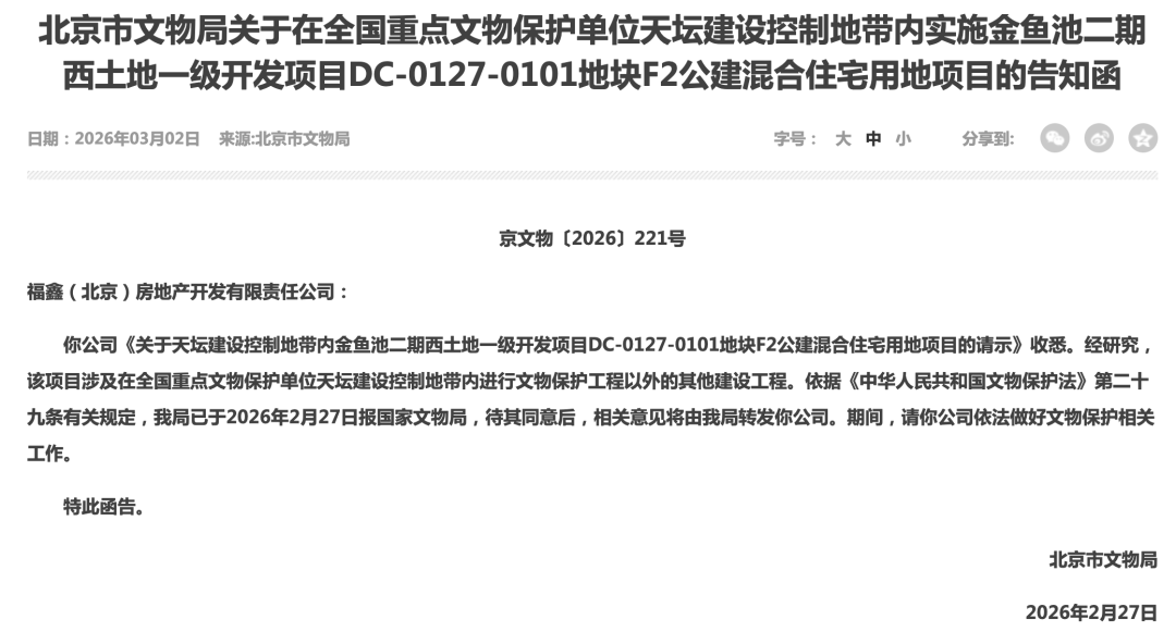直到今年2月27日,一封来自北京市文物局的告知函,揭开了金鱼池地块“难产”的冰山一角。